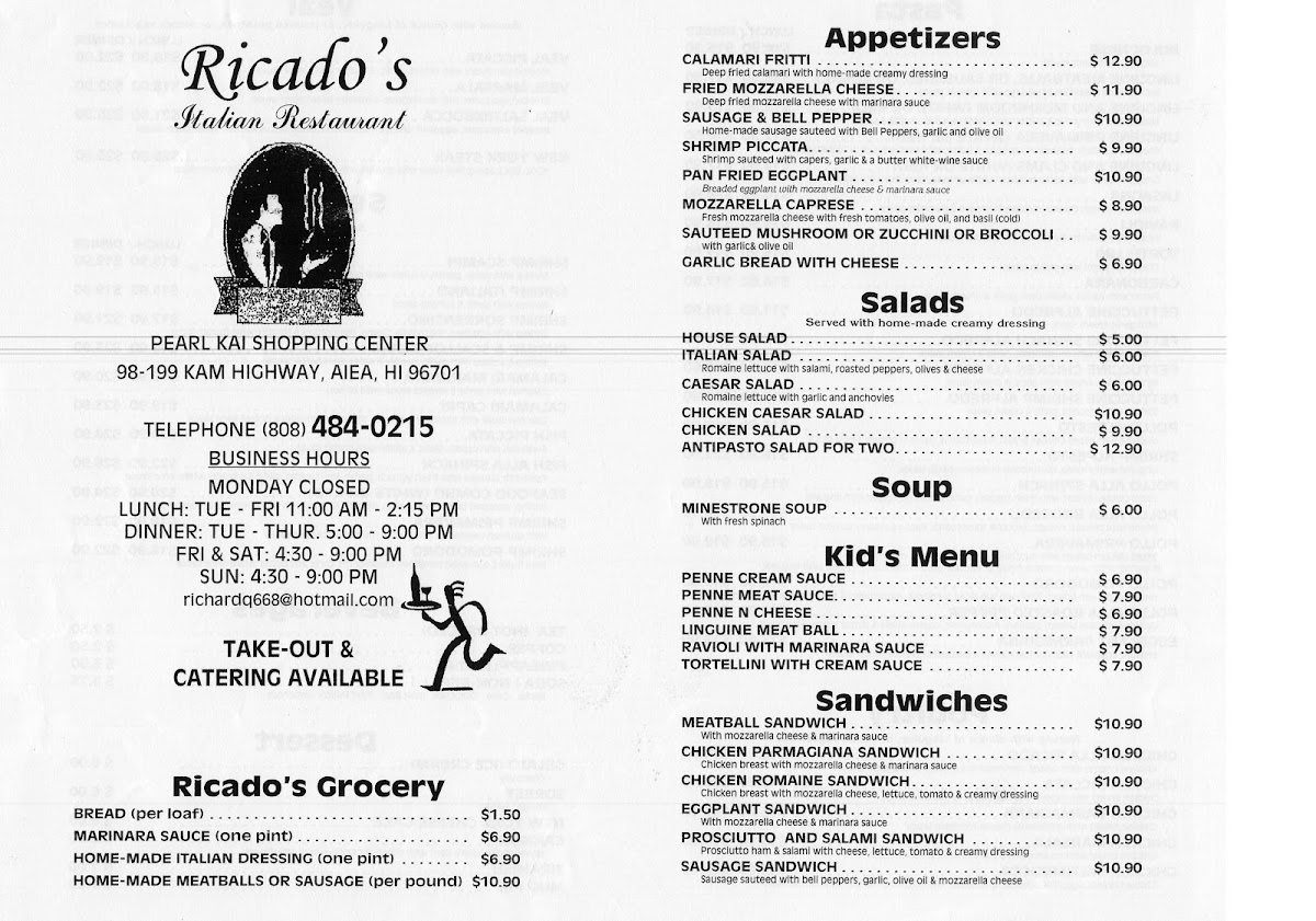Parking is plentiful, and the restaurant's prime location, just across from Pearlridge Downtownside, allows for a convenient outing. Whether you're celebrating a birthday or simply enjoying a night out with friends, Ricado's Italian Restaurant promises to deliver a memorable dining experience filled with delicious flavors, exceptional service, and a warm, inviting atmosphere.